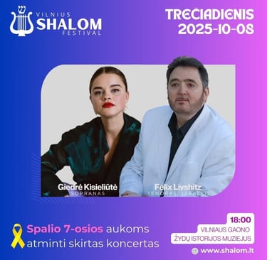 Spalio 8 dieną 18:00 val. Vilniaus Gaono žydų istorijos muziejuje „Vilnius Shalom Festival“ kviečia kartu paminėti antrąsias tragiškų spalio 7-osios žudynių metines. Koncerte pasirodys:
