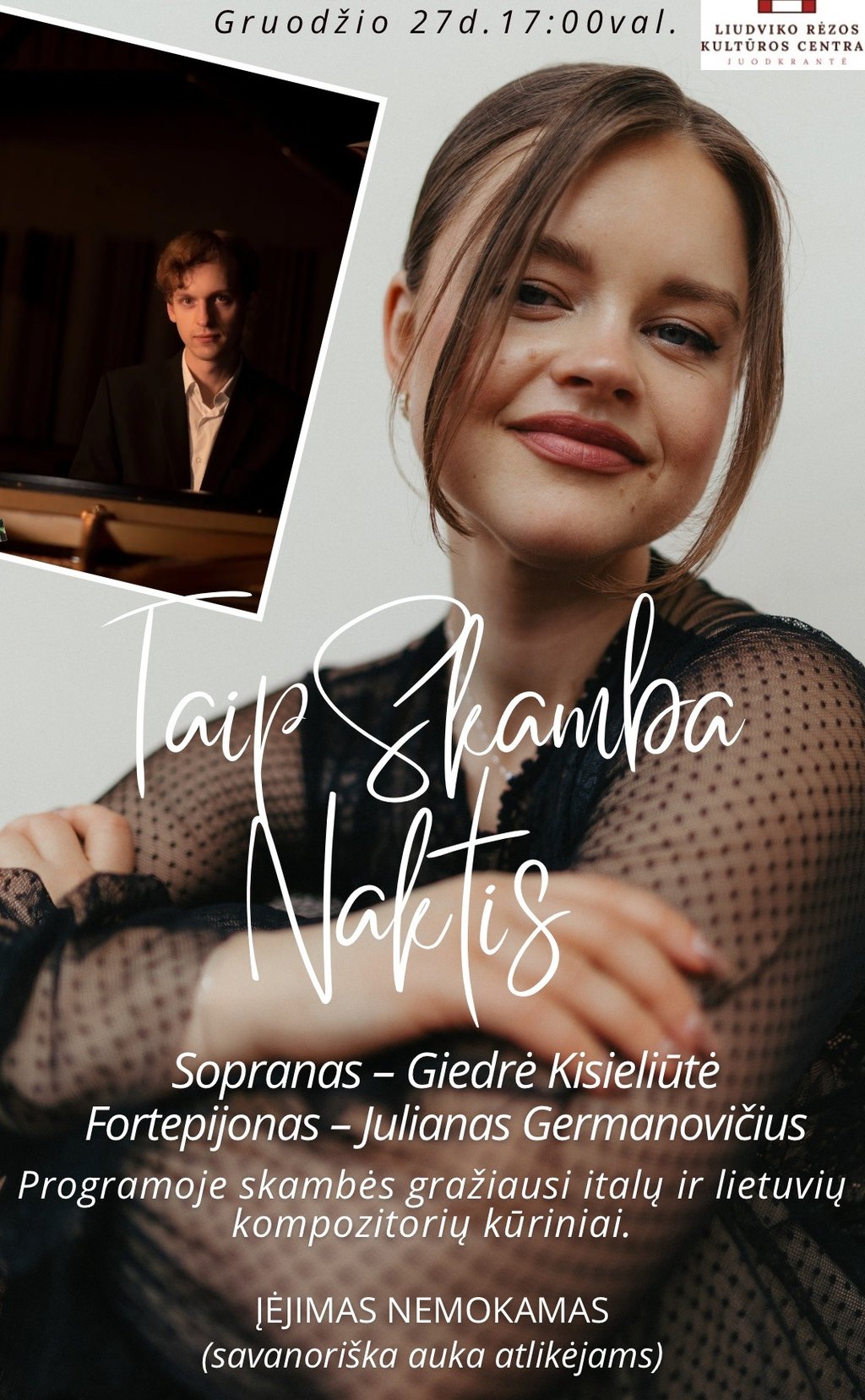 Kviečiame! Gruodžio 27d. 17val. į jaukų vakarą Juodkrantėje L. Rėzos kultūros namus. Programoje laukia gražiausia lietuvių bei italų kompozitorių muzika.