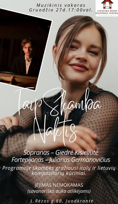 Kviečiame! Gruodžio 27d. 17val. į jaukų vakarą Juodkrantėje L. Rėzos kultūros namus. Programoje laukia gražiausia lietuvių bei italų kompozitorių muzika.